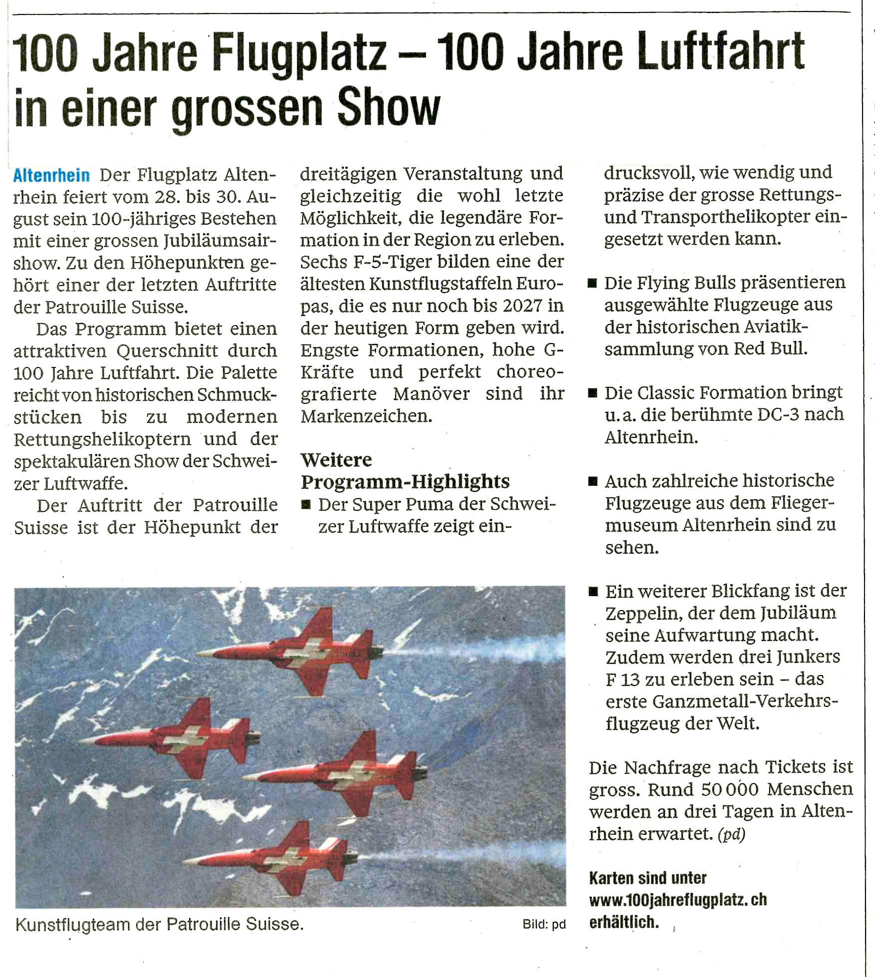 Luftfahrt ist spektakulär, Luftfahrt ist faszinierend, Luftfahrt verblüfft mit technologischen Wunderwerken und historischen Meisterleistungen der Pioniere. All das gibt es gebündelt an drei Tagen zum 100. Geburtstag des Flugplatzes in Altenrhein. Emotionaler Höhepunkt in einem an Attraktionen reichen Programm ist einer der letzten Auftritte der legendären Patrouille Suisse.