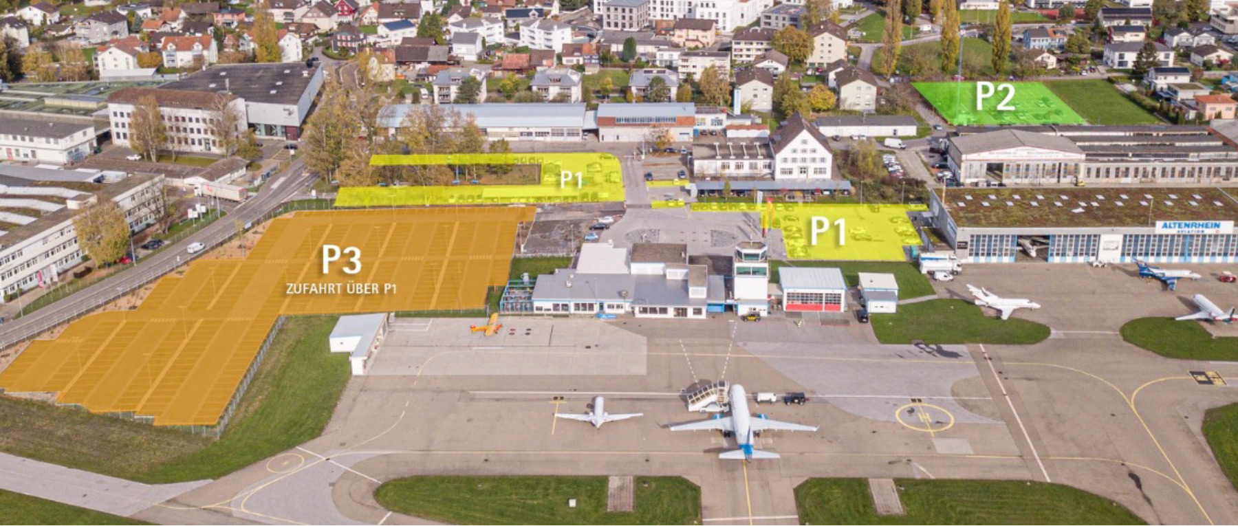 - Im Nordosten der Flugpiste stehen mehrere Parkplatzzonen zur Verfügung.